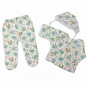 Комплект состоит из распашонки с рукавчиками трансформерами и с кнопочкой на одной стороне, ползунков на резинке, чепчика. Все швы у набора выполнены наружу. Рисунки в каждой партии отличаются.