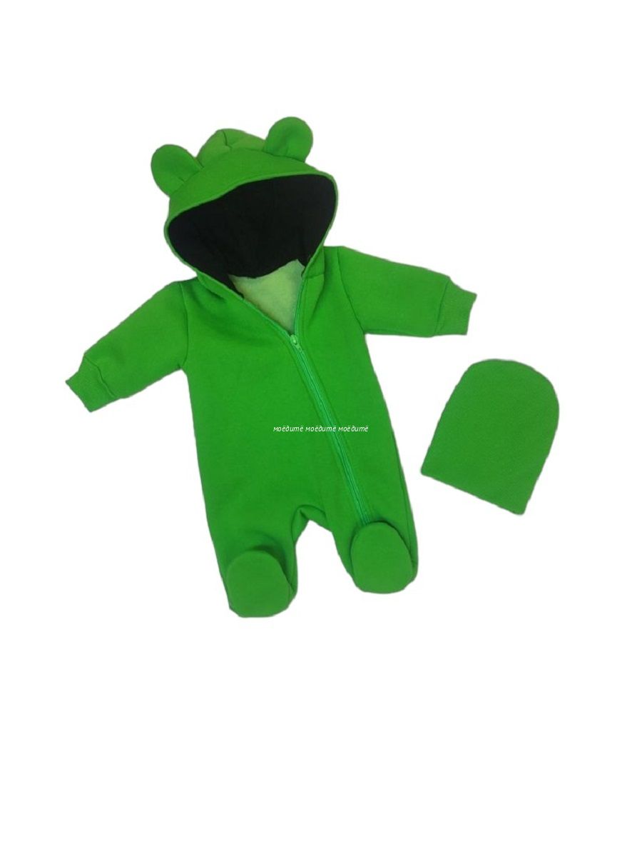 "МоёДитё" комбинезон выполнен из футера с начёсом. Комбинезон с капюшоном на подкладке и декорирован сверху ушками, с закрытыми ножками, рукава на манжетах, спереди косая молния до конца одной ножки. Шапочка из кашкорсе можно одевать как с отворотом, так и без. Очень хорошо тянется.