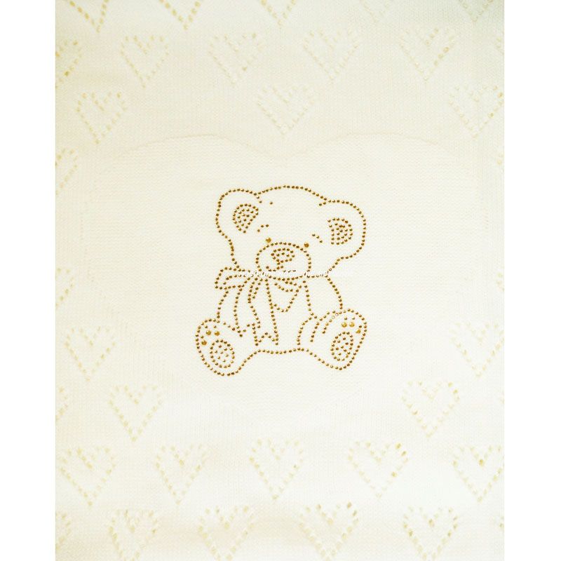 Плед вязаный, с ажурным рисунком в виде сердечек, посередине с рисунков в виде мишки из страз.